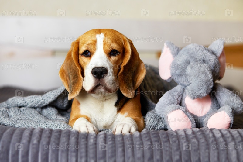 Собака породы бигль лежит на кровати под серым вязаным одеялом рядом с мягкой пушистой игрушкой-слоном