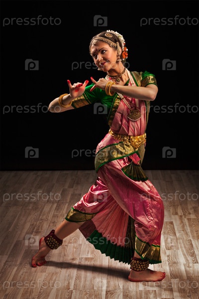 Молодая красивая женщина, танцовщица индийского классического танца Бхаратанатьям в позе Кришны