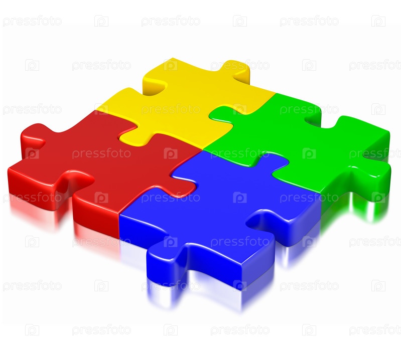 Корпоративная концепция бизнеса, командной работы, партнерства, коммуникационного сотрудничества: кусочки головоломки красного, синего, зеленого и желтого цвета изолированы на белом фоне