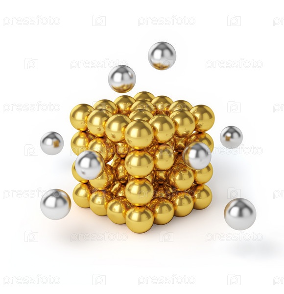 Концепция бизнес-командной работы в Интернете - металлические сферы, собирающиеся в золотую кубическую структуру, изолированную на белом фоне