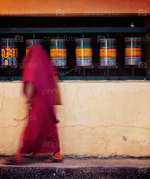 Винтажное ретро-эффектное изображение хипстерского стиля буддийского монаха с четками, проходящим и вращающим молитвенные колеса на коре вокруг комплекса Цуглакханг в Маклеод-Гандже, Химачал-Прадеш, Индия