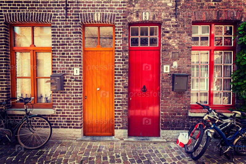 Двери старых домов и велосипеды в европейском городе. Брюгге Брюгге, Бельгия