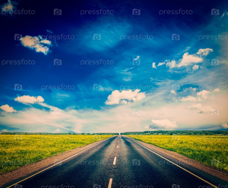 Винтажный ретро-эффект отфильтровал хипстерский стиль изображения фона концепции путешествия - дорога на цветущем весеннем лугу