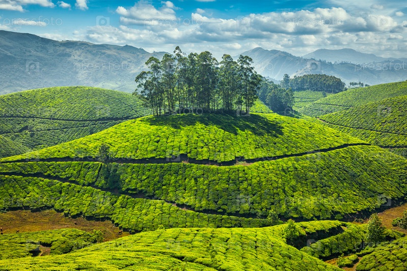 Плантации зеленого чая с рощей в Муннаре, Керала, Индия