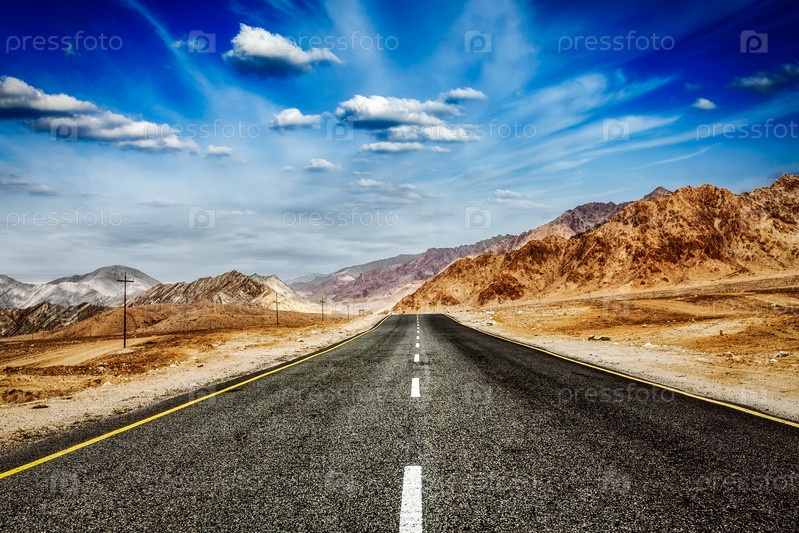 Путешествие вперед концептуальные фоновые обои - дорога в Гималаях и драматические облака голубого неба. Ладакх, Джамму и Кашмир, Индия