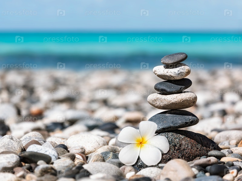 Дзен-медитация спа-релаксация фон - сбалансированная стопка камней с цветком франжипани плюмерия крупным планом на морском пляже