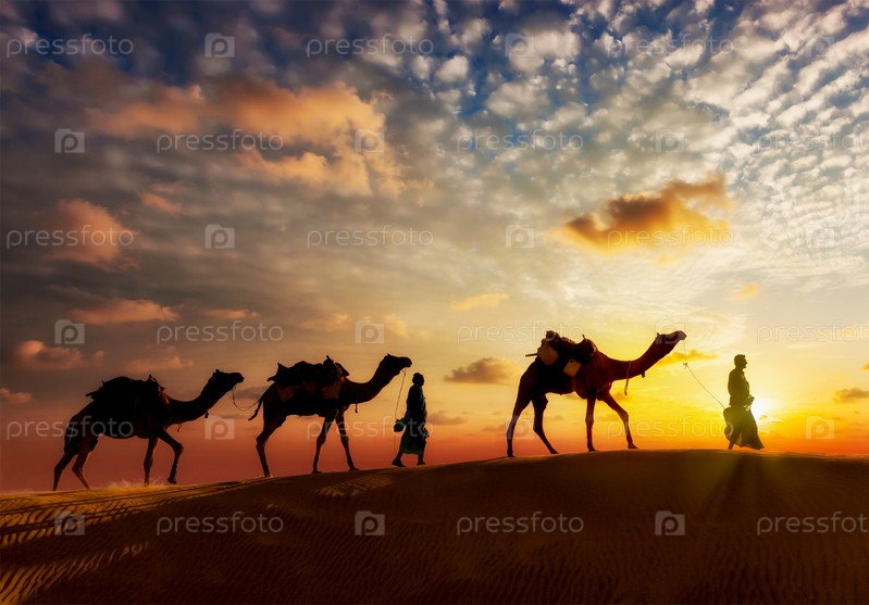 Фон путешествия - два погонщика верблюдов (погонщики верблюдов) с силуэтами верблюдов в дюнах пустыни на закате