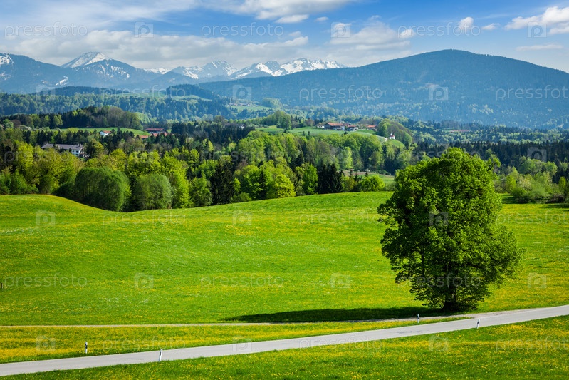 Дорога в пасторальной идиллической немецкой сельской местности на фоне Баварских Альп в прекрасный летний день