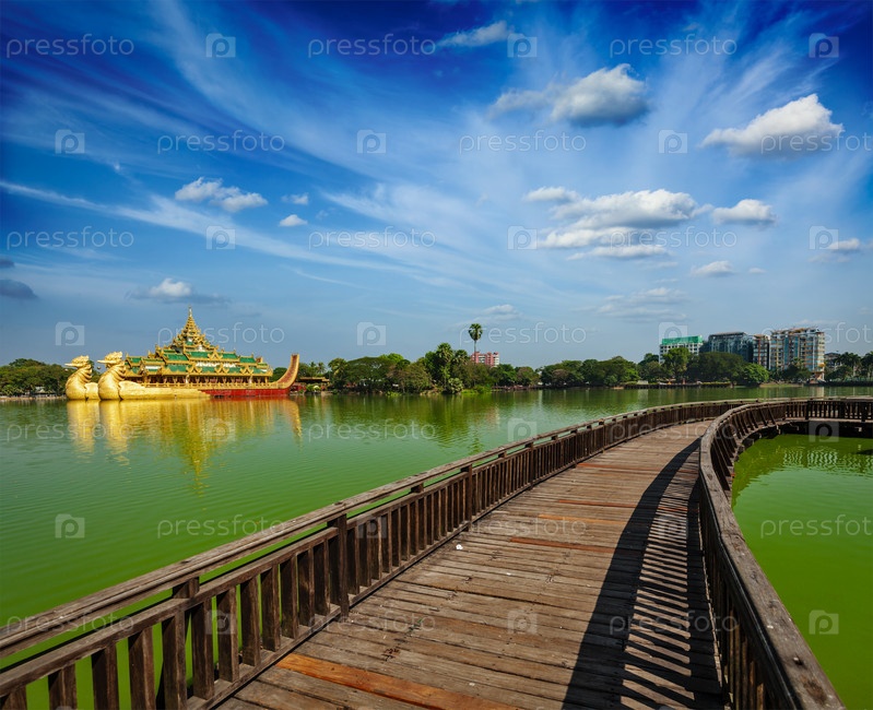 Знаковая достопримечательность Янгона и туристическая достопримечательность Каравейк - копия бирманской королевской баржи на озере Кандавги и природном парке Кандавги, Янгон, Мьянма, Бирма