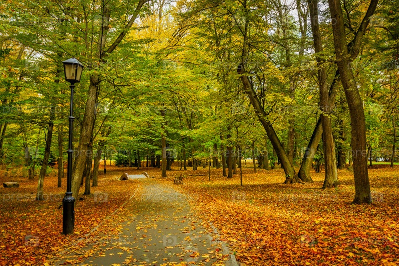 Аллея в осеннем парке с желтыми листьями на земле