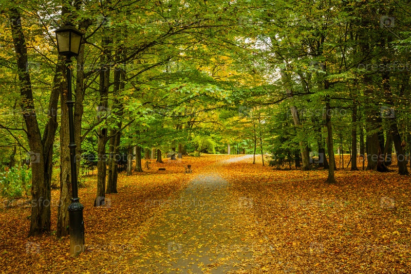Аллея в осеннем парке с желтыми листьями на земле