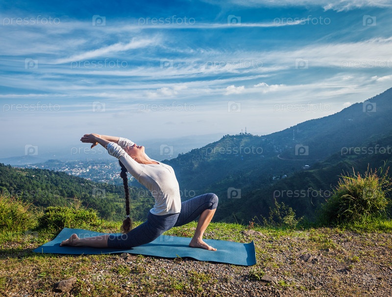 Женщина практикует асану йоги Анжанеясана на открытом воздухе