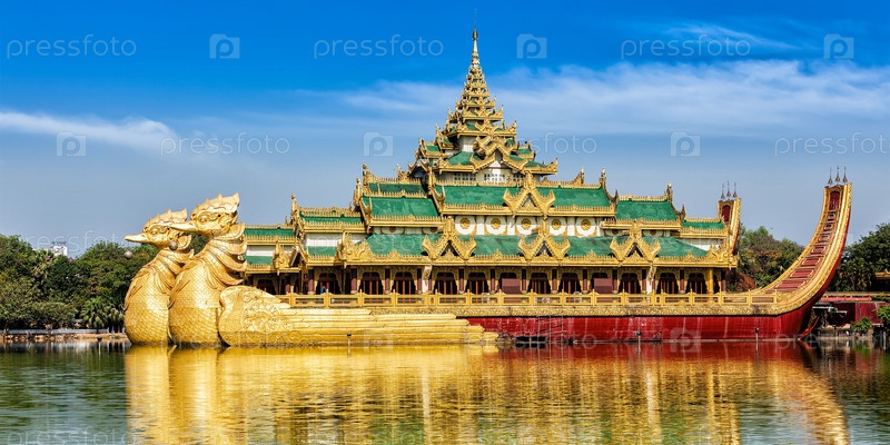 Панорама знаковой достопримечательности и туристической достопримечательности Янгона: Каравейк - копия бирманской королевской баржи на озере Кандавги, Янгон, Мьянма (Бирма)