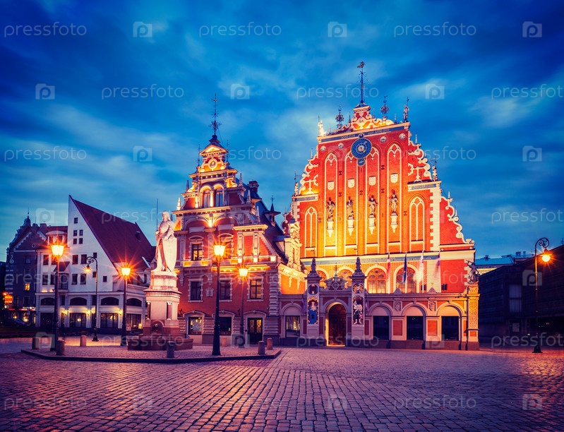Винтажный ретро-эффект отфильтровал хипстерское изображение Ратушной площади Риги, Дома Черноголовых и статуи Святого Роланда, освещенной в вечерних сумерках, Рига, Латвия