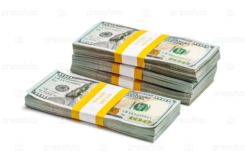 Креативная концепция финансирования бизнеса, зарабатывающая деньги - стопка пачек банкнот номиналом 100 долларов США 2013 года, изолированных на белом