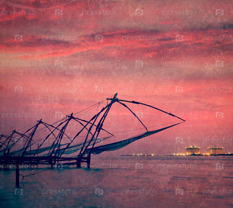 Винтажное ретро-хипстерское туристическое изображение китайских рыболовных сетей Кочи на закате. Форт Кочин, Кочи, Керала, Индия