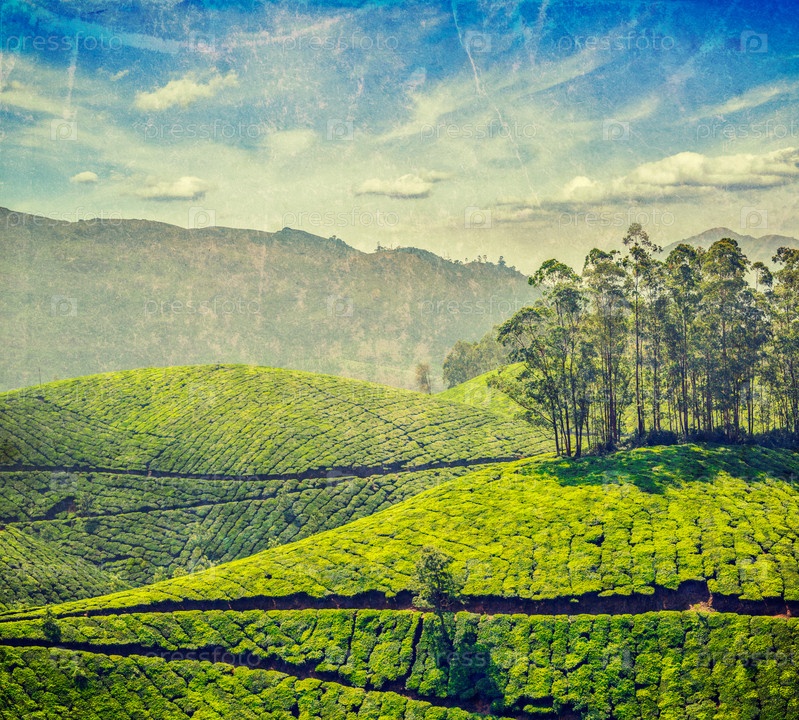 Винтажное ретро-хипстерское туристическое изображение чайных плантаций с наложенной гранжевой текстурой. Муннар, Керала, Индия