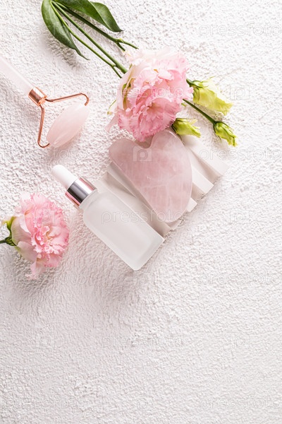Белый матовый флакон с натуральным средством, сывороткой, массажным маслом, роликовым массажером и гуаша на подиуме с тиснением из белой гипсовой штукатурки среди цветов. Концепция ухода