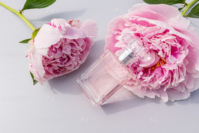 Красивый хрустальный флакон женских духов с нежным ароматом лежит на шикарном розовом цветке пиона. Презентация аромата. Передний план