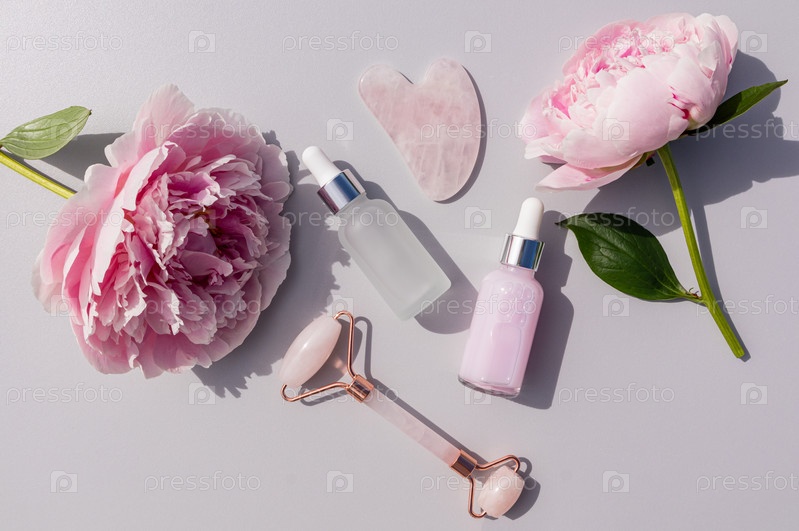 Две косметические бутылочки с пипеткой с натуральным продуктом для кожи лица, роликовым массажером, гуаша на сером фоне среди пионов