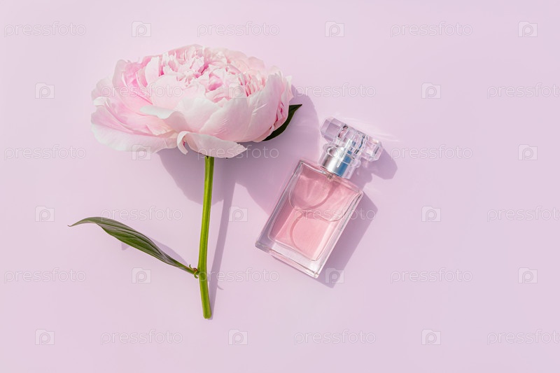 Элегантный флакон женских духов с нежными ароматами на сиреневом фоне с розовыми цветами пиона. Пустая упаковка. презентация