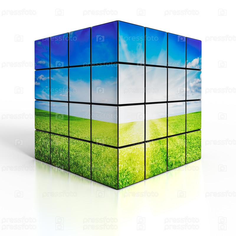 Концепция охраны окружающей среды экологии - кубики с красивым пейзажем на белом отражающем фоне