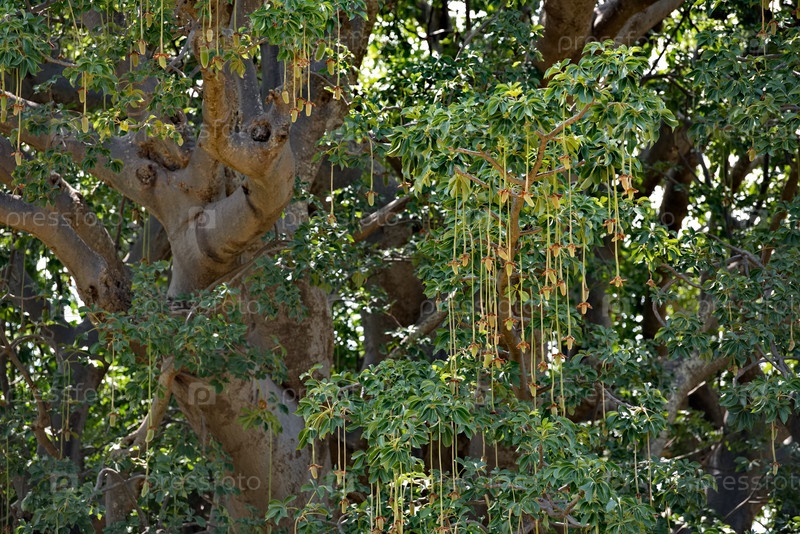 Западная Африка. Сенегал. Увесистые плоды овальной формы на гигантских баобабах возле побережья Атлантического океана