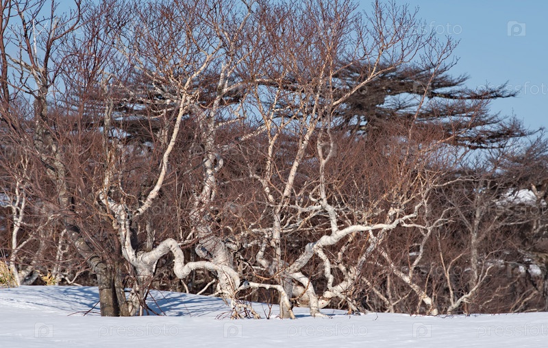 Россия. Дальний Восток, остров Итуруп. Причудливая неуклюжесть каменной березы, которая растет только на Камчатке и Курильских островах, формируется из-за постоянных ветров с Тихого океана