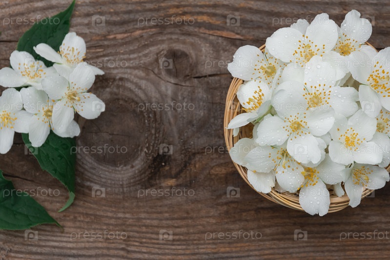 Белые цветы жасмина на деревянном фоне с копией пространства в центре