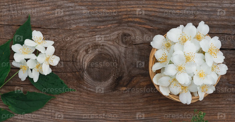 Баннер с деревянным фоном и белыми цветами жасмина с местом для копирования в центре