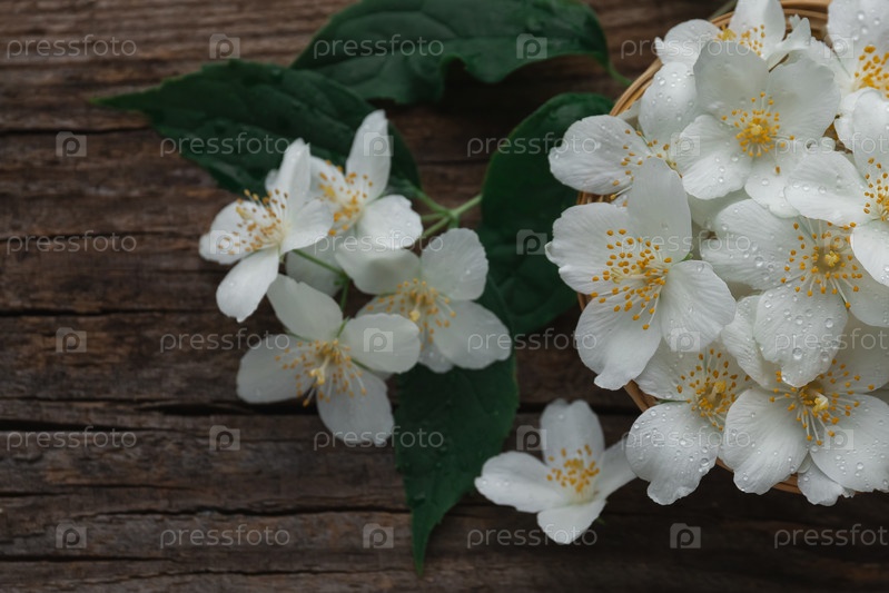 Белые цветы жасмина на деревянном фоне для приготовления чая