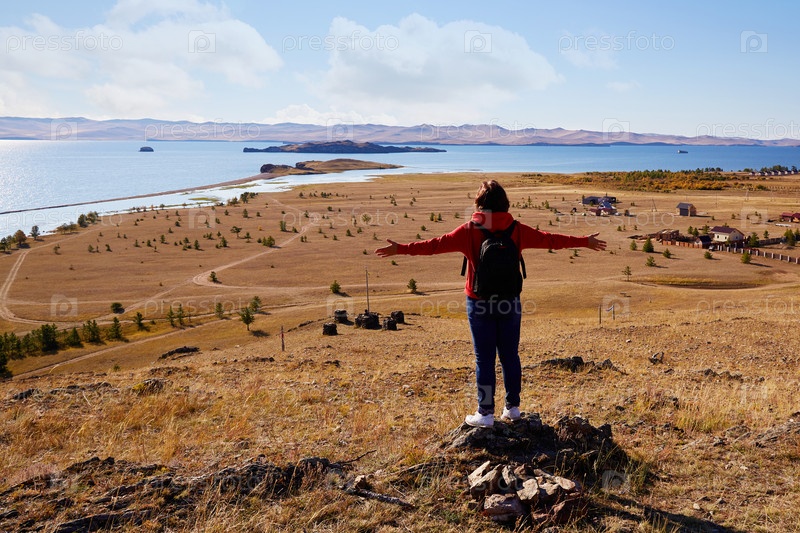 Женщина с рюкзаком любуется прекрасным видом на озеро в солнечный день
