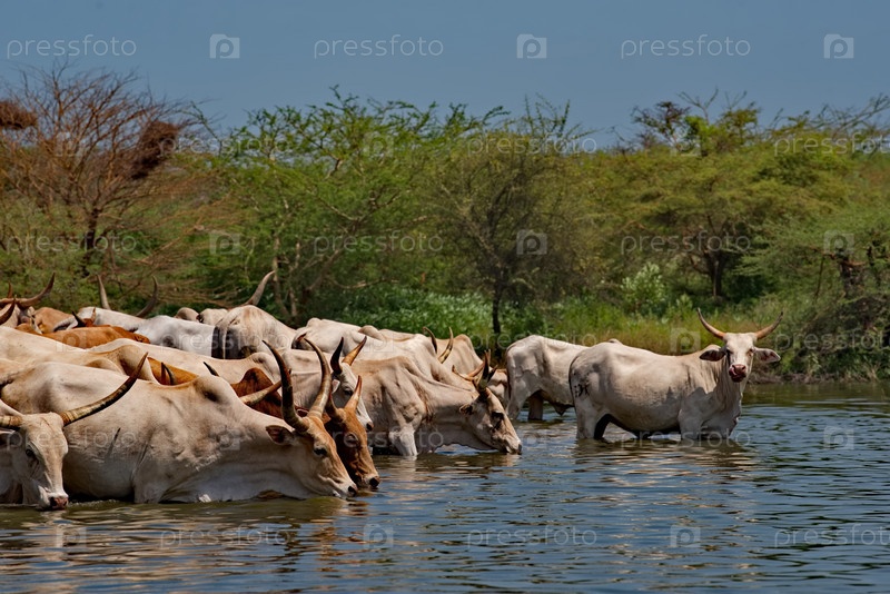 Западная Африка. Сенегал. Стадо горбатых коров Зебу с огромными рогами пьют воду из небольшого озера на побережье Атлантического океана