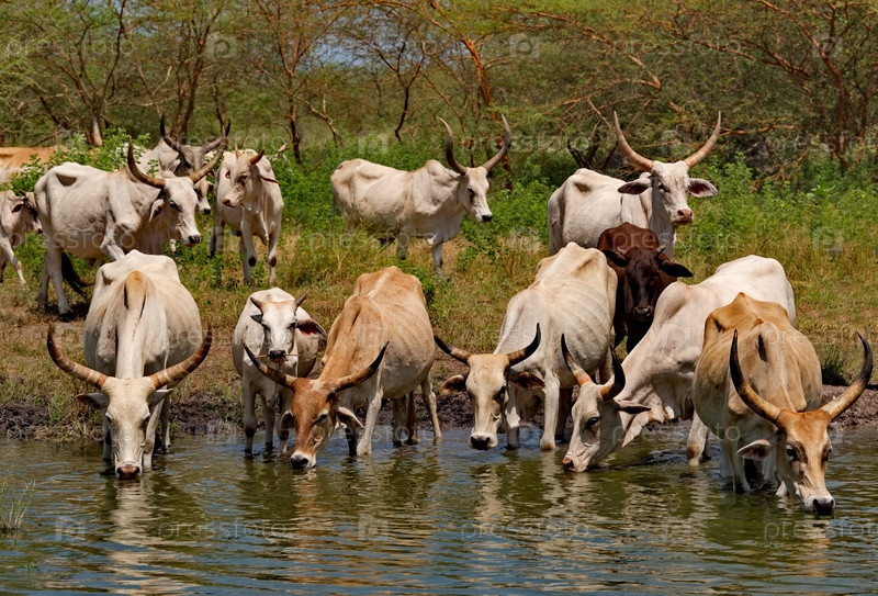 Западная Африка. Сенегал. Стадо горбатых коров Зебу с огромными рогами пьют воду из небольшого озера на побережье Атлантического океана