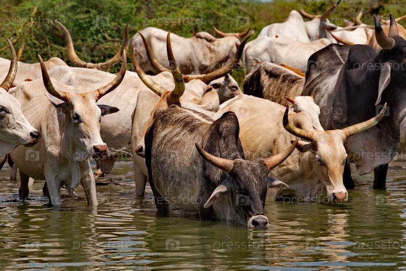Западная Африка. Сенегал. Стадо горбатых коров Зебу с огромными рогами пьют воду из небольшого озера на побережье Атлантического океана