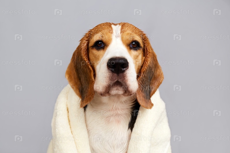 Мокрая собака породы бигль в белом полотенце после купания