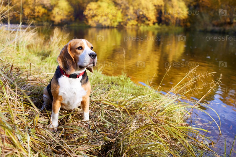 Красочный осенний пейзаж. Собака породы бигль сидит в сухой траве у реки