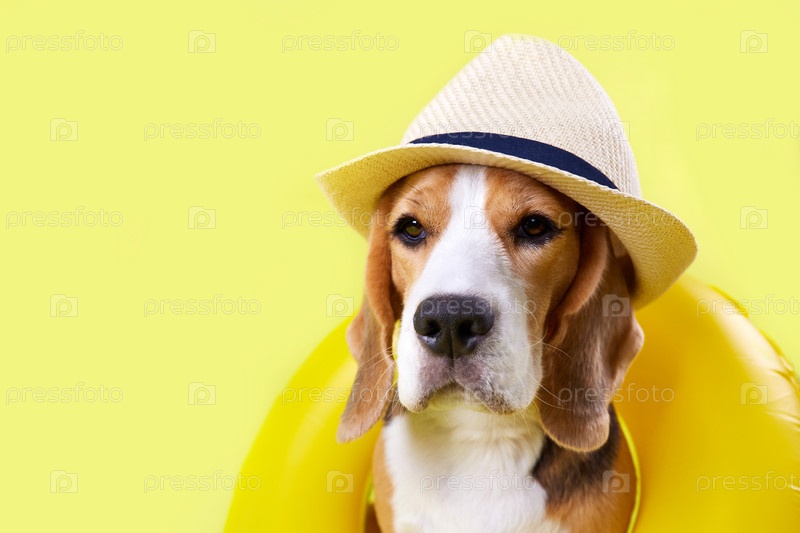 Собака-бигль в соломенной шляпе и плавательном круге на желтом фоне