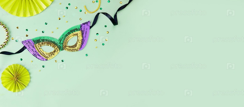 Праздничная красочная карнавальная маска для фестиваля Марди Гра на сиреневом фоне со сверкающими конфетти