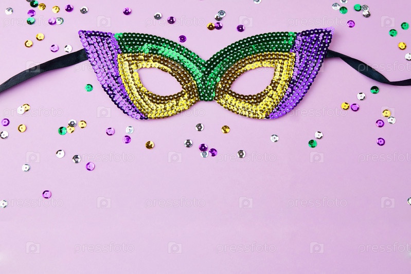 Праздничная красочная карнавальная маска для фестиваля Марди Гра на сиреневом фоне со сверкающими конфетти