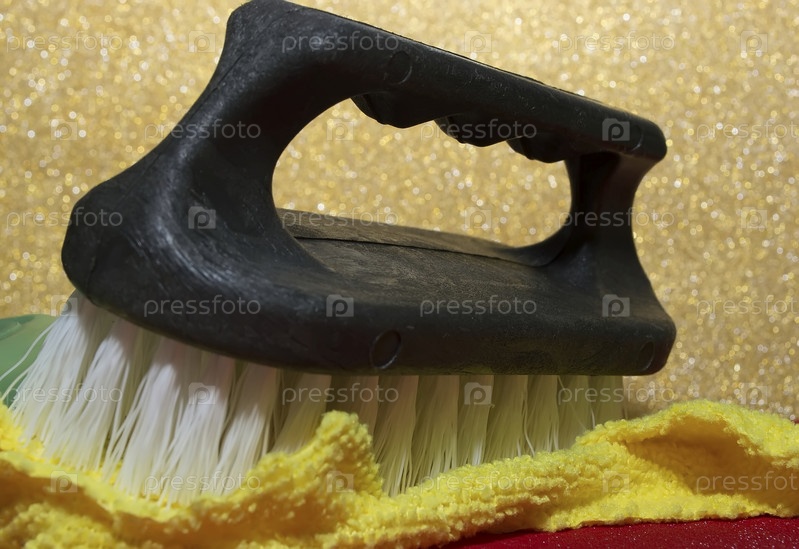 Концепция чистки. Черная щетка с белой щетиной на комбинированном блестящем фоне из красного и золотого материала лежит на желтой салфетке из микрофибры