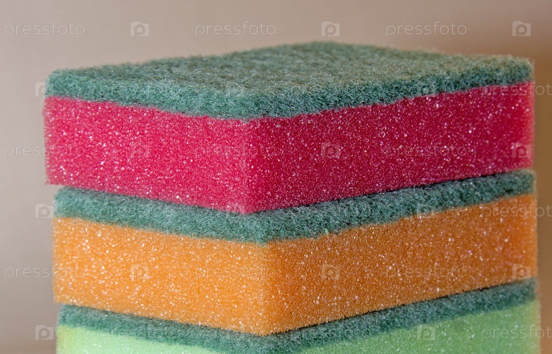 Концепция уборки за собой. Губки для посуды разных цветов складываются стопкой. Инструмент для наведения порядка в доме, на кухне