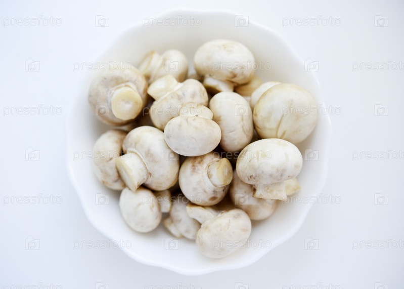 Белые грибы в чашке. Шампиньоны на белом фоне