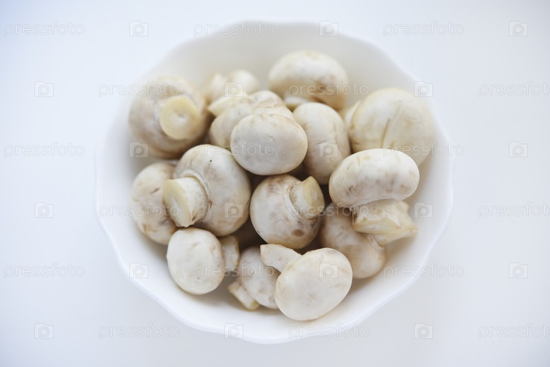 Белые грибы в чашке. Шампиньоны на белом фоне