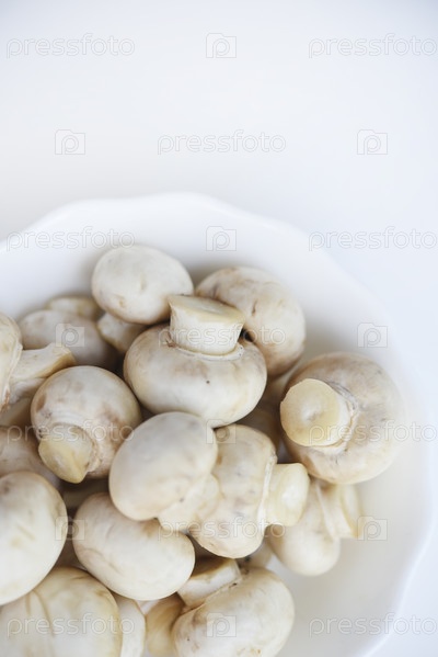 Белые грибы в чашке. Шампиньоны на белом фоне