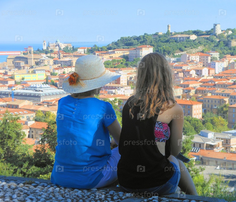 Снимок двух женщин, наслаждающихся видом на небольшой европейский городок. Люди