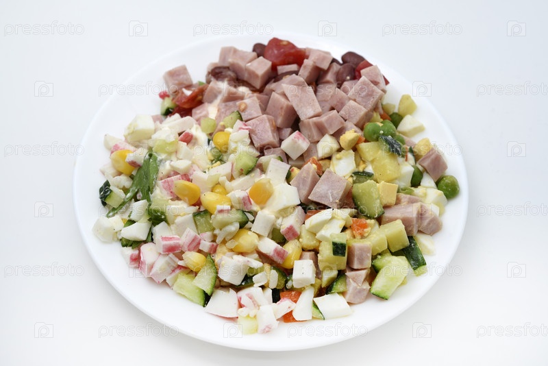 Разнообразный салат на белой тарелке. Мясно-овощной салат. Вкусный завтрак