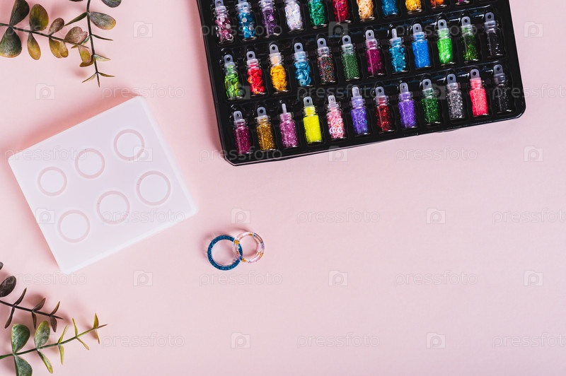 Кольца из эпоксидной смолы, форма и блестки для изготовления на розовом фоне, вид сверху