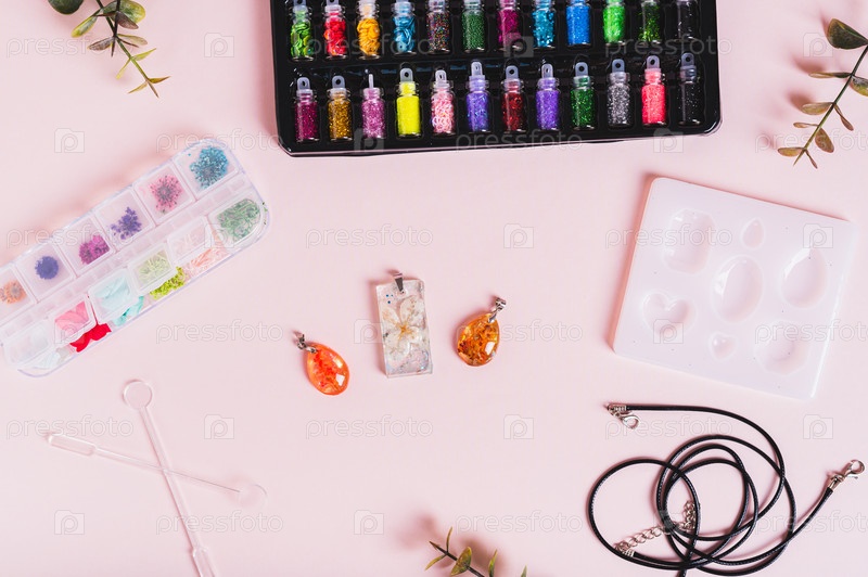 Подвески, формы и блестки из эпоксидной смолы для изготовления на розовом фоне, вид сверху