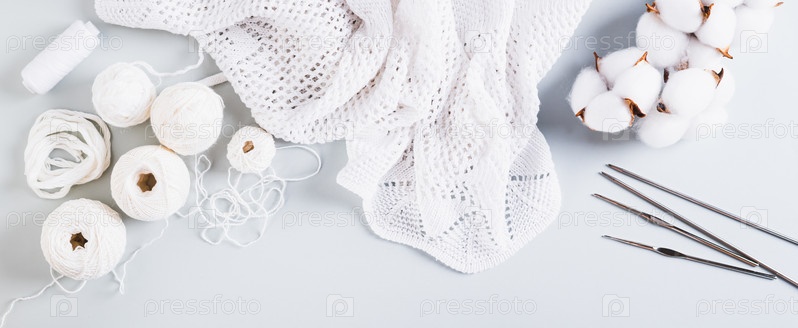 Концепция вязания, шарики, нитки, крючки и спицы на синем веб-баннере сверху